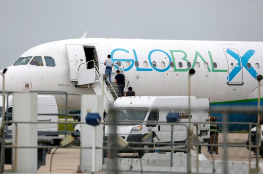 20일 미국 인디애나주 게리시카고 공항에서 미국 이민세관단속국(ICE)에 구금된 이민자들이 비행기에 오르고 있다. 로이터 연합뉴스 |