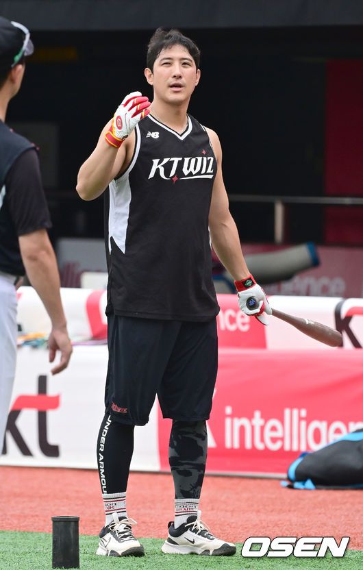 [OSEN=수원, 김성락 기자] 24일 오후 수원 KT위즈파크에서 2025 신한 SOL Bank KBO리그 KT 위즈와 LG 트윈스의 경기가 열렸다. KT는 헤이수스, 엘지는 치리노스를 선발투수로 내세웠다 경기 시작에 앞서 KT 황재균이 훈련을 하고 있다. 2025.06.24 / ksl0919@osen.co.kr