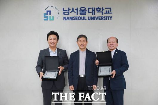[더팩트ㅣ천안=정효기 기자] 남서울대학교는 24일 총장실에서 김철환·육종영 천안시의회 의원에게 '매주저수지 수변산책로' 조성 사업에 대한 공로를 인정하여 감사패를 전달했다고 밝혔다.