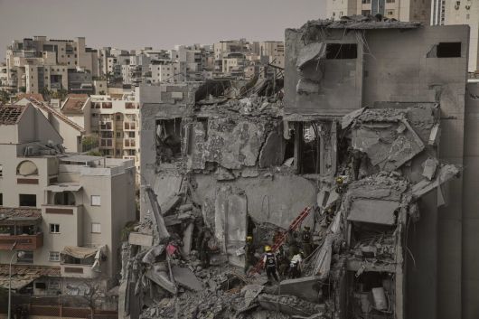 24일 이란의 공습으로 건물들이 파괴된 이스라엘 남부 베르셰바. 베르셰바/AP 연합뉴스 |