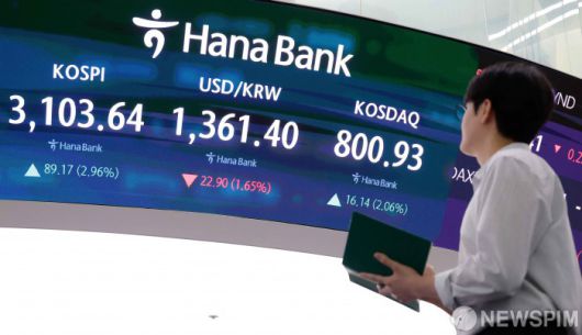 [서울=뉴스핌] 류기찬 인턴기자 = 코스피와 코스닥 종가가 각각 3,100선, 800선을 돌파한 24일 오후 서울 중구 하나은행 딜링룸에서 딜러들이 업무를 보고 있다. 이날 코스피 지수는 전 거래일 대비 89.17포인트(2.96%) 오른 3,103.64에, 코스닥은 16.14포인트(2.06%) 오른 800.93에 장을 마감했다. 2025.06.24 ryuchan0925@newspim.com