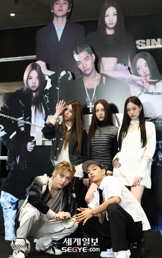 올데이 프로젝트(ALLDAY PROJECT)가 23일 서울 강남구 일상비일상의틈byU+에서 열린 데뷔 싱글 '페이머스'(FAMOUS) 발매 기념 팝업 스토어 행사에 참석해 포즈를 취하고 있다. |