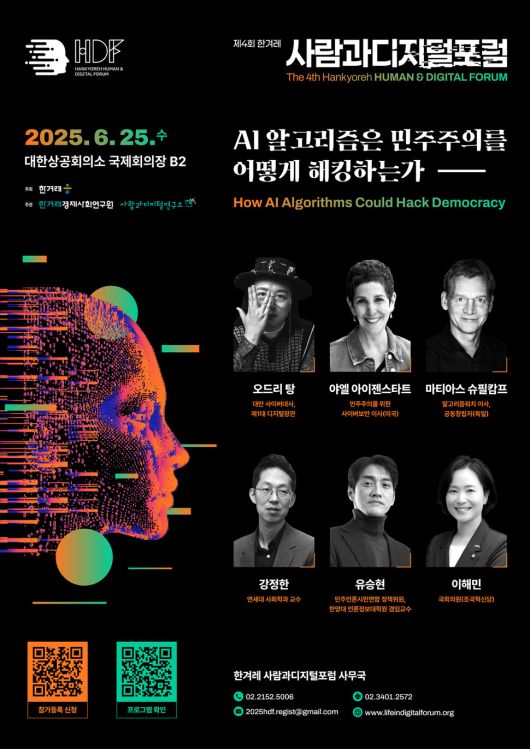 한겨레신문사가 주최하는 제4회 사람과디지털포럼이 25일 오전 8시30분 서울 중구 대한상공회의소 국제회의장에서 ‘인공지능(AI) 알고리즘은 민주주의를 어떻게 해킹하는가’를 주제로 열린다.