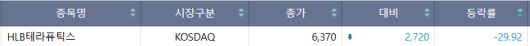 코스닥 시장에서 하한가를 기록한 종목은 HLB테라퓨틱스다. HLB테라퓨틱스가 이날 미국 자회사 리젠트리가 진행한 신경영양성각막염(NK) 치료제 'RGN-259'의 유럽 임상3상 결과 통계적 유효성을 확보하지 못했다고 밝히면서 하락한 것으로 풀이된다.