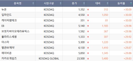 이날 코스닥 시장에서는 뉴온, 딥마인드, 케이피엠테크, E8, 브릿지바이오테라퓨틱스, 폴라리스세원, 아스타, 텔콘RF제약, 에이비온, 카카오게임즈 등 10종목이 상한가를 기록했다.