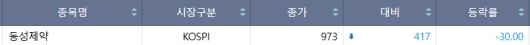 코스피 시장에서 하한가를 기록한 종목은 동성제약이다. 동성제약이 전일 공시를 통해 서울회생법원으로부터 회생 절차 개시 결정문을 받았다고 밝힌 영향으로 보인다.