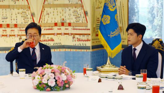 이재명 대통령이 22일 한남동 관저에서 열린 여야 지도부와 오찬에서 음료를 마시고 있다. 오른쪽은 김용태 국민의힘 비상대책위원장. 대통령실통신사진기자단 |