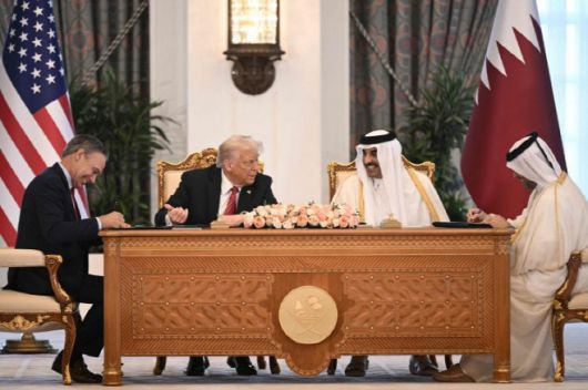 도널드 트럼프 미국 대통령(왼쪽 두번째)과 타밈 빈 하마드 알사니 카타르 국왕(오른쪽 두번째 )이 지난달 14일(현지시간) 카타르 도하 왕궁에서 열린 비즈니스 계약 서명식에서 서명을 하고 있다./AFP 연합 |