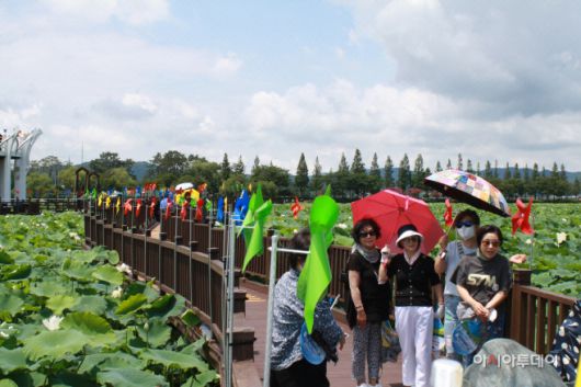 동양 최대 백련 자생지인 무안군 회산 백련지를 찾은 관광객들이 순백의 백련을 보기 위해 데크길을 걷고 있다./이명남 기자 |