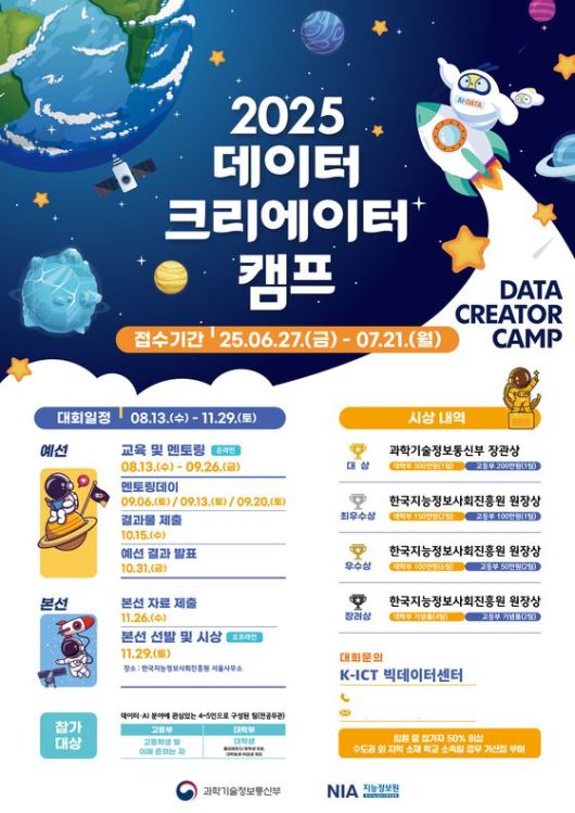 한국지능정보사회진흥원(원장 황종성, 이하 NIA)과 과학기술정보통신부(장관 유상임, 이하 과기정통부)는 AI·데이터 분석 저변 확대와 창의적 인재 양성을 위해 “2025년 데이터 크리에이터 캠프(Data Creator Camp)” 참가팀을 오는 6월 27일(금)부터 7월 21일(월)까지 모집한다.