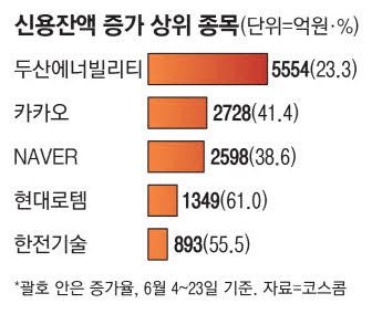 24일 코스콤 CHECK에 따르면 대선 직후인 지난 4일부터 23일까지 신용잔액이 가장 많이 증가한 종목은 두산에너빌리티였다. 이 기간 두산에너빌리티 주가는 67.52% 상승했는데, 신용잔액 역시 23.3%(1296억원) 늘었다.