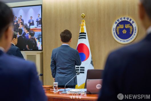 [서울=뉴스핌] 이재명 대통령이 24일 서울 용산구 대통령실에서 열린 제27회 국무회의에서 국기에 대한 경례를 하고 있다. [사진=대통령실] 2025.06.24 photo@newspim.com