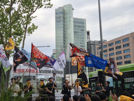 넥슨 자회사 네오플 노조가 각 팀마다 디자인한 깃발을 들고 집회에 참가하고 있다. 김민정 기자 |