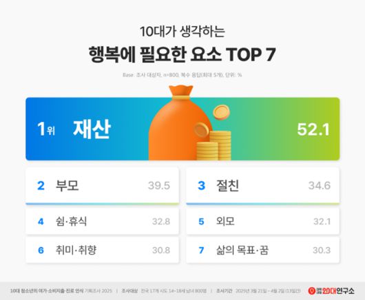 연구소에 따르면 10대 청소년이 '행복을 위해 필요하다'고 답한 요소는 '재산'(52.1%)이 가장 많았다. 이어 △부모(39.5%) △절친한 친구(34.6%) △쉼·휴식(32.8%) △외모(32.1%) △취미·취향(30.8%) △삶의 목표·꿈(30.3%) 등의 순으로 집계됐다.