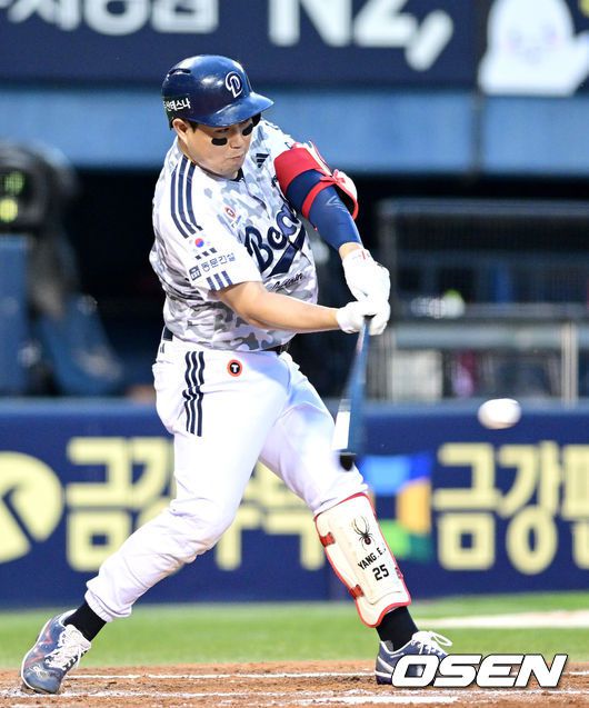 [OSEN=잠실, 최규한 기자] 24일 서울 잠실야구장에서 ‘2025 신한 SOL Bank KBO리그’ 두산 베어스와 SSG 랜더스의 경기가 열렸다. 홈팀 두산은 최원준, 방문팀 SSG은 미치 화이트를 선발로 내세웠다. 3회말 무사 만루 상황 두산 양의지가 달아나는 1타점 적시타를 날리고 있다. 2025.06.24 / dreamer@osen.co.kr
