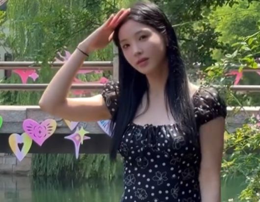 사진 속 강다은은 상하이의 한 수변 산책로에서 검은색 꽃무늬 원피스를 입고 포즈를 취했다.