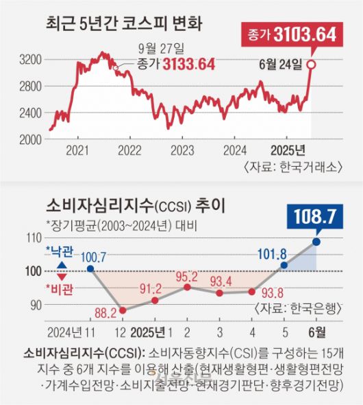 새 정부 경기 부양책에 대한 기대감은 증시뿐만 아니라 소비 심리도 끌어올렸다. 한국은행에 따르면 6월 소비자심리지수(CCSI)는 108.7로 2021년 6월(111.1) 이후 4년 만에 가장 높았다. 주택가격전망지수도 120으로 2021년 10월 이후 3년 8개월 만에 가장 높았다.
