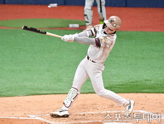 [스포츠투데이 팽현준 기자] 24일 서울 고척스카이돔에서 열린 2025 KBO리그 KIA 타이거즈와 키움 히어로즈의 경기, 3회말 무사 1,2루 키움 전태현이 1타점 적시타를 때리고 있다. 2025.06.24. [스포츠투데이 팽현준 기자 sports@stoo.com]