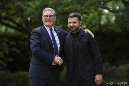 [런던=AP/뉴시스] 볼로디미르 젤렌스키(오른쪽) 우크라이나 대통령과 키어 스타머 영국 총리가 23일(현지 시간) 런던 총리 관저에서 만나 악수하고 있다. 두 정상은 정상회담 후 양국이 방위산업 공동생산에 나서기로 했다고 밝혔다. 이날 젤렌스키 대통령은 평소의 군복 대신 검은색 재킷을 입었다. 2025.06.24. /사진=민경찬 |
