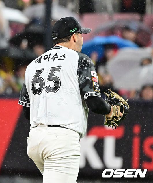 [OSEN=수원, 김성락 기자] 24일 오후 수원 KT위즈파크에서 2025 신한 SOL Bank KBO리그 KT 위즈와 LG 트윈스의 경기가 열렸다. KT는 헤이수스, LG는 치리노스를 선발투수로 내세웠다. 6회초 2사 만루 KT 헤이수스가 LG 박해민을 2루수 땅볼로 처리한 뒤 기뻐하고 있다. / ksl0919@osen.co.kr