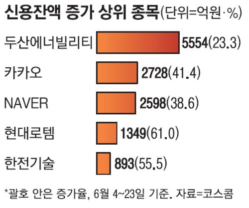 새 정부가 들어서며 집중적으로 수혜를 본 네이버·카카오 역시 ‘빚투’가 크게 늘었다. 카카오는 이 기간 주가가 56.66% 오르면서 신용잔액이 41.4%(1130억원) 늘었다. 네이버 역시 신용잔액이 38.6%(1002억원) 늘었다.