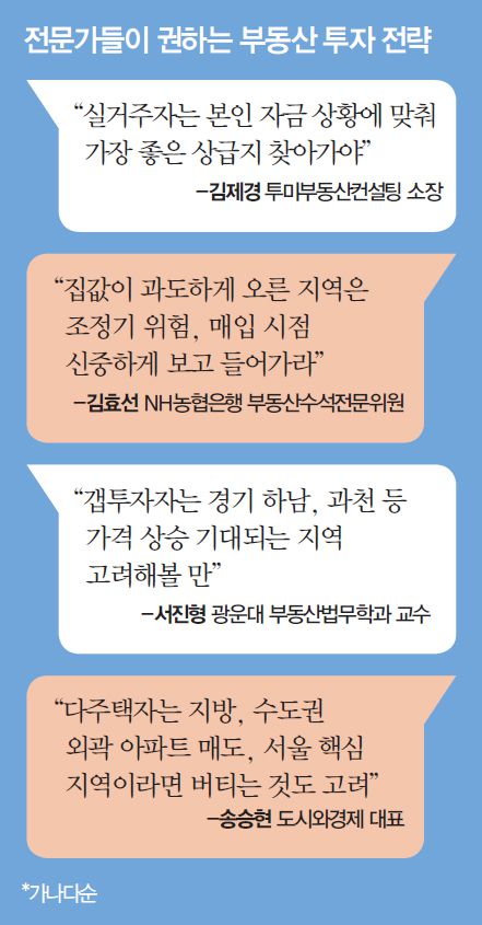 김효선 NH농협은행 부동산수석전문위원은 “최근 들어 집값이 과도하게 오른 지역은 장기적으로는 우상향해도 조정기가 올 수 있다”며 “매입 타이밍을 우선 고려하는 것이 좋다”고 설명했다. 권일 부동산인포 리서치팀장 역시 “7월 이후 시장 변화를 예의 주시한 뒤, 상대적으로 가격이 조정된 매물을 찾아볼 것을 권한다”고 말했다.
