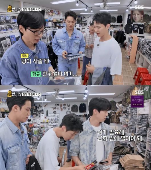 이날 유재석, 유연석, 호시, 민규는 첫 번째 틈 장소로 군장점을 찾았다. 민규는 하반기 입대를 앞둔 호시에게 “로카(ROKA) 티셔츠 하나씩 입겠냐”고 제안했다. 이를 들은 유재석은 “내가 사주겠다. 운동할 때 입어라”라고 선뜻 계산에 나섰다.