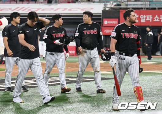 [OSEN=수원, 김성락 기자] 24일 오후 수원 KT위즈파크에서 2025 신한 SOL Bank KBO리그 KT 위즈와 LG 트윈스의 경기가 열렸다. 이날 경기는 KT 위즈가 LG 트윈스를 상대로 5-0으로 승리했다. 경기 종료 후 LG 선수들이 아쉬워하고 있다. 2025.06.24 / ksl0919@osen.co.kr
