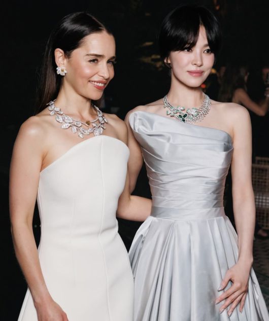 최근 송혜교는 자신의 SNS에 근황을 담은 사진을 게재했다. 공개된 사진 속에는 우아한 실버 드레스를 입은 송혜교와 화이트 드레스를 입은 에밀리아 클라크가 나란히 선 모습이 담겼다. 두 사람 모두 화려한 보석 목걸이를 착용했지만, 그보다 더 눈길을 끄는 건 압도적인 미모와 아우라였다.