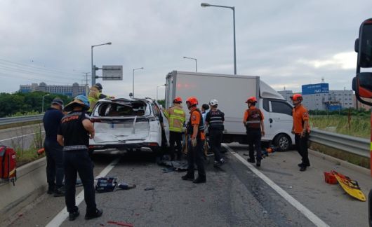 이날 사고는 40대 A씨가 몰던 트레일러 차량이 앞서가던 스포츠유틸리티차(SUV)를 들이받고 충격으로 이 차량이 앞으로 밀려나면서 1t 화물차를 추돌한 것으로 파악됐다.
