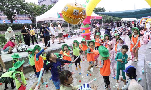 24일 서울 송파구 성내천물놀이장을 찾은 어린이들이 박 터뜨리기를 하고 있다. 이날 개장한 성내천물놀이장은 워터슬라이드, 숲속 물놀이장, 트릭아트 포토존, 몽골텐트(그늘막) 등이 설치돼 있다. 남정탁 기자 ⓒ 세상을 보는 눈, 세계일보