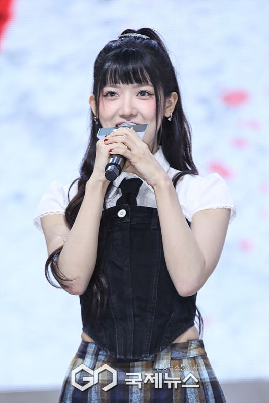 (서울=국제뉴스) 이대웅 기자 = 신예 걸그룹 베이비 돈 크라이(Baby DONT Cry) 쿠미가 23일 오후 서울 용산구 한남동 블루스퀘어에서 열린 데뷔 싱글 '에프 걸(F Girl)' 발매 기념 쇼케이스에 참석해 인사말을 하고 있다.