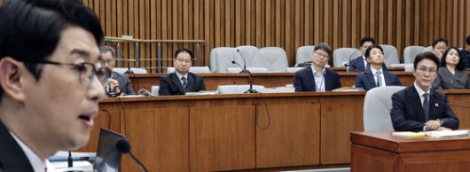 24일 인사청문회에 출석한 김민석 국무총리 후보자(오른쪽)가 자금 출처 등 여러 의혹을 제기해온 주진우(왼쪽) 국민의힘 의원의 발언을 듣고 있다. 김성룡 기자 |