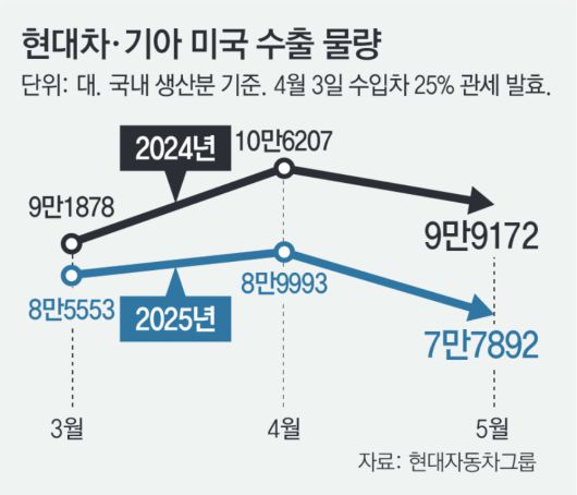 도널드 트럼프 2기 행정부의 자동차 관세 25% 영향이 본격화하고 있는 것으로 나타났다. 지난달 한국에서 생산한 현대자동차·기아의 미국 수출 물량이 1년 전보다 20% 넘게 줄었다. 글로벌 전기차 캐즘(일시적 수요 둔화)도 국내 자동차 산업에 악재로 작용하면서 전방위적인 정책 대응이 시급하다는 지적이 나온다.