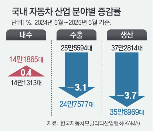 최대 시장인 미국에서 현대차와 기아 수출량이 줄면서 국내 자동차 생산도 줄었다. 한국자동차모빌리티산업협회(KAMA)에 따르면 지난달 국내 자동차 생산 물량은 35만8969대로 전년 동월(37만2814대) 대비 3.7% 줄었다. 같은 기간 현대차와 기아의 생산량은 6.0%, 3.8% 감소했다.