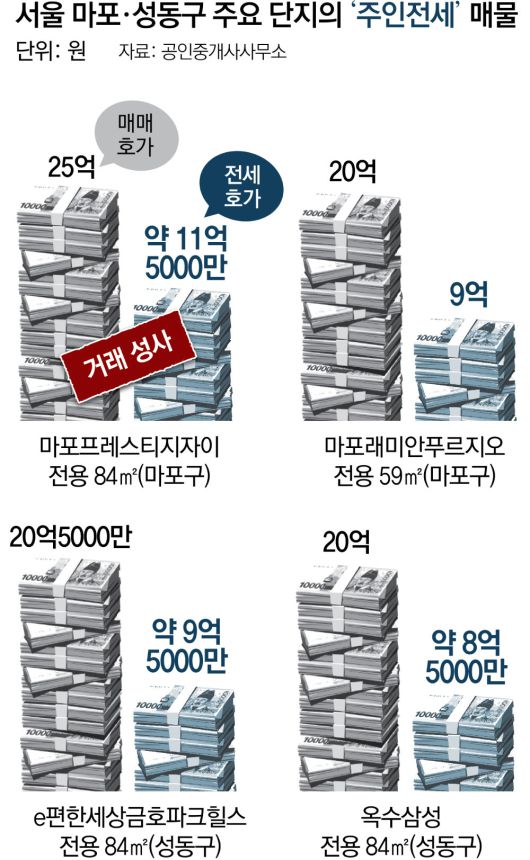 마포구와 성동구 일대 공인중개사들은 대규모 단지에는 주인전세 매물이 적지 않다고 입을 모은다. 성동구에 있는 1114채 규모 옥수삼성에는 주인전세 조건을 내건 전용면적 84m² 매물이 20억 원에 나와 있다. 인근 공인중개사는 “집주인이 요즘 전세 시세보다 최소 5000만 원 이상 높은 8억5000만 원에 세입자로 거주할 계획”이라고 설명했다.