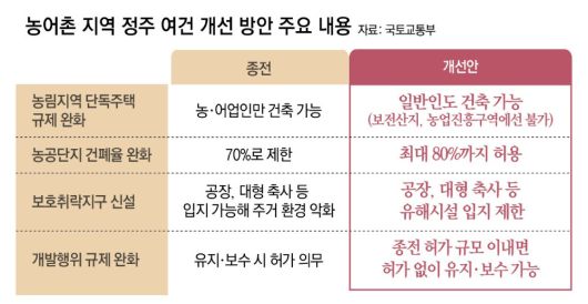 이전에는 농어업인만 농림지역에서 농·어가를 지을 수 있었다. 일반인이 농림지역에서 단독주택을 지으려면 농림지역 중 농업보호구역(1384km²)에서만 가능했다. 다만 개정안 시행 이후에도 산림 훼손 우려가 있는 보전산지(3만9755km²)나 농지 보전을 위해 지정되는 농업진흥구역(7880km²)에는 기존 규제가 유지된다.