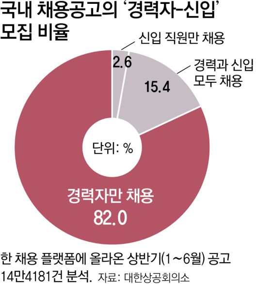대한상공회의소가 24일 발표한 ‘상반기(1∼6월) 채용시장 특징과 시사점 조사’ 보고서에 따르면 국내의 한 채용 플랫폼에 올라온 상반기 채용공고 14만4181건을 전수 분석한 결과 경력직만을 대상으로 한 채용 공고 비율이 전체의 82.0%에 달했다. 신입과 경력 직원을 모두 뽑겠다는 채용 공고는 15.4%, 신입 직원만 뽑겠다는 공고는 2.6%에 그쳤다.