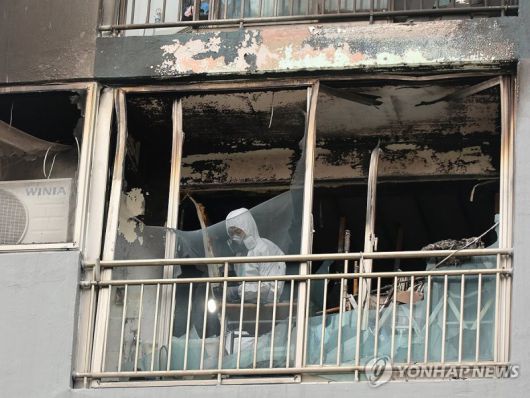 새벽 시간대 발생한 화재로 자매가 참변을 당한 24일 오후 부산 부산진구의 한 아파트 화재 현장(출처=연합뉴스) |