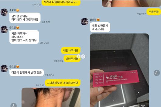 공개된 사진에는 김지민과 김준호의 카카오톡 대화 내용이 담겨 있다. 김지민이 "땀띠 너무 가려워"라고 하자, 김준호는 "긁으면 안돼유. 머리 붙여서 그런가봐유"라며 "지금 약국가서 땀띠 연고 사서 발라유"라고 걱정했다.