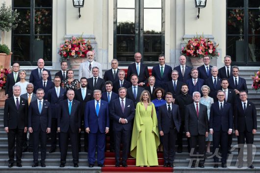 (헤이그 로이터=뉴스1) 김지완 기자 = 24일(현지시간) 네덜란드 헤이그 하우스텐보스 왕궁에서 북대서양조약기구(NATO·나토) 회원국 정상들이 빌럼 알렉산더르 네덜란드 국왕과 막시마 여왕이 주최한 만찬에 앞서 기념촬영을 하고 있다. 2025.06.24 ⓒ 로이터=뉴스1 Copyright ⓒ 뉴스1. All rights reserved. 무단 전재 및 재배포, AI학습 이용 금지.