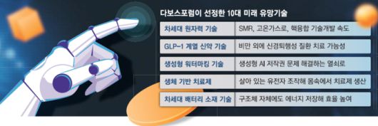 세계경제포럼(WEF·다보스포럼)이 꼽은 올해 10대 미래유망기술에 소형모듈원자로(SMR) 같은 첨단 원자력 기술을 포함해 알츠하이머병 치료제 가능성이 대두되고 있는 글루카곤 유사 펩타이드-1(GLP-1) 기반의 신약 기술, 생성형 인공지능(AI) 저작권 문제를 해결할 생성형 워터마킹 기술 등이 선정됐다. 향후 3~5년 내 사회와 경제에 지대한 영향을 미칠 기술이란 평가다.
