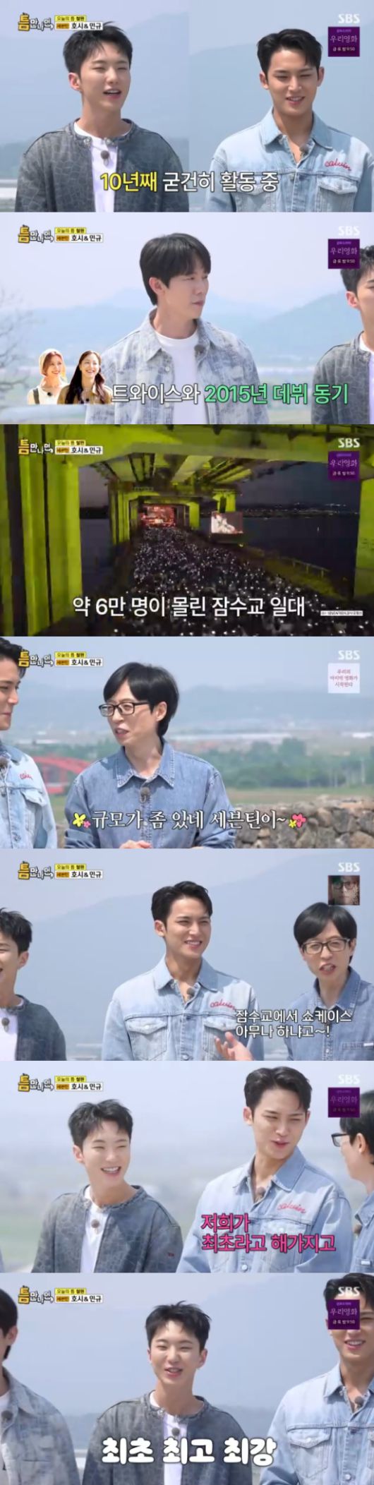 유재석은 "그룹활동 10년은 정말 쉽지 않다"고 했고, 이어 최근에 잠수교에서 대규모 쇼케이스를 한 것을 언급하면서 "잠수교 쇼케이스를 아무나 하냐. 그건 허가를 받아야 하는 것 아니냐"고 놀라워했다.