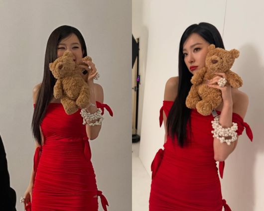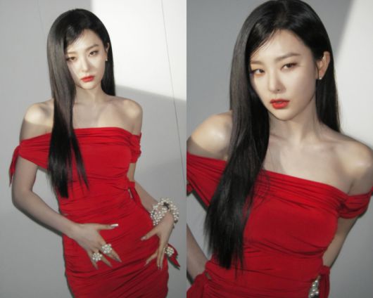 공개된 사진 속 슬기는 레드 립에 레드 오프숄더 원피스로 '핫'한 코디를 완성했다. 그에 진주 팔찌와 반지로 우아함까지 소화했다.