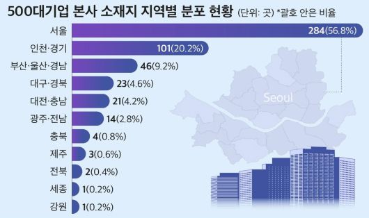 25일 기업데이터연구소 CEO스코어가 국내 500대 기업의 본사 소재지를 조사한 결과 284곳(56.8%)이 서울에 본사를 뒀다.