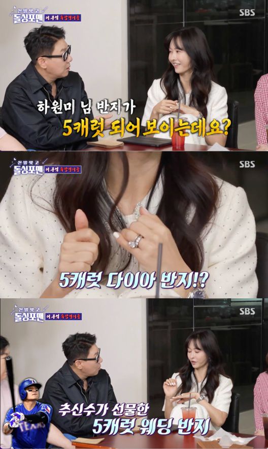 하원미가 남편 추신수에게 받은 5캐럿 다이아 반지를 자랑했다.