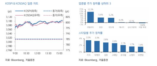 이어 “지수 상방은 열고 가더라도, 급등 업종 중심으로 차익 실현 성격의 숨 고르기 장세 출현 가능성을 대응 전략에 반영해 나가야 할 시점”이라고 덧붙였다.