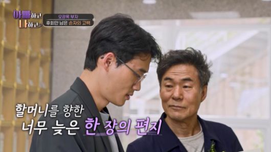 두 사람은 먼저 석 달 전 돌아가신 오광록의 어머니가 계신 봉안당에 도착했다. 오시원은 “할머니 뵈러 내려오는데 할머니가 여전히 안아줄 것 같았다”며 할머니를 그리워했다. 또 오시원은 할머니의 연락을 받지 않은 것에 대한 미안함을 직접 편지 읽기로 전했다. 이에 오광록은 “아들이 후회했다. 내가 더 애쓰고 찾아가고 문을 두드려야 했는데…내가 부족해서 너무 늦었다”며 자신 때문에 할머니와의 시간을 놓쳐버린 아들에 대한 미안함을 드러냈다.