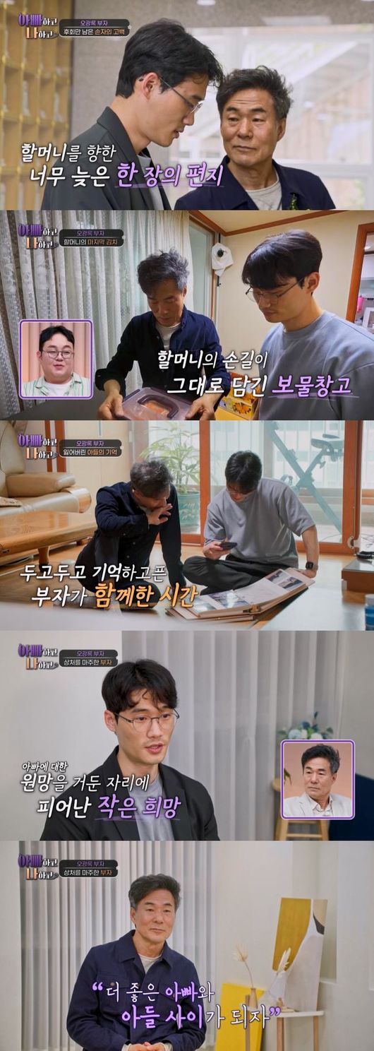 두 사람은 먼저 석 달 전 돌아가신 오광록의 어머니가 계신 봉안당에 도착했다. 오시원은 “할머니 뵈러 내려오는데 할머니가 여전히 안아줄 것 같았다”며 할머니를 그리워했다. 또 오시원은 할머니의 연락을 받지 않은 것에 대한 미안함을 직접 편지 읽기로 전했다. 이에 오광록은 “아들이 후회했다. 내가 더 애쓰고 찾아가고 문을 두드려야 했는데…내가 부족해서 너무 늦었다”며 자신 때문에 할머니와의 시간을 놓쳐버린 아들에 대한 미안함을 드러냈다.