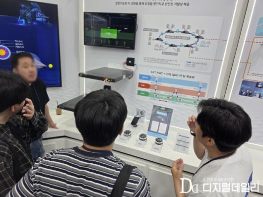 SK텔레콤 부스 관계자는 “아이온큐에서 개발된 장비에서 전송되는 데이터에 SK텔레콤 PQC를 결합해 양자암호 기반 데이터를 끝단(엔드포인트)까지 보낼 수 있도록 해, 라스트마일 보안을 강화한 것이 핵심”이라며 “이처럼 (PQC) 소프트웨어를 활용해 QKD 설치가 어려운 곳까지 양자보안키를 보내는 것이 업계 추세”라고 강조했다.